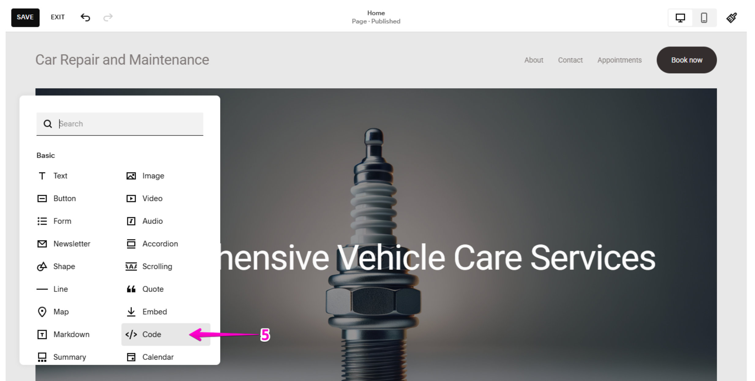 - In the Block Selector menu, choose Code.